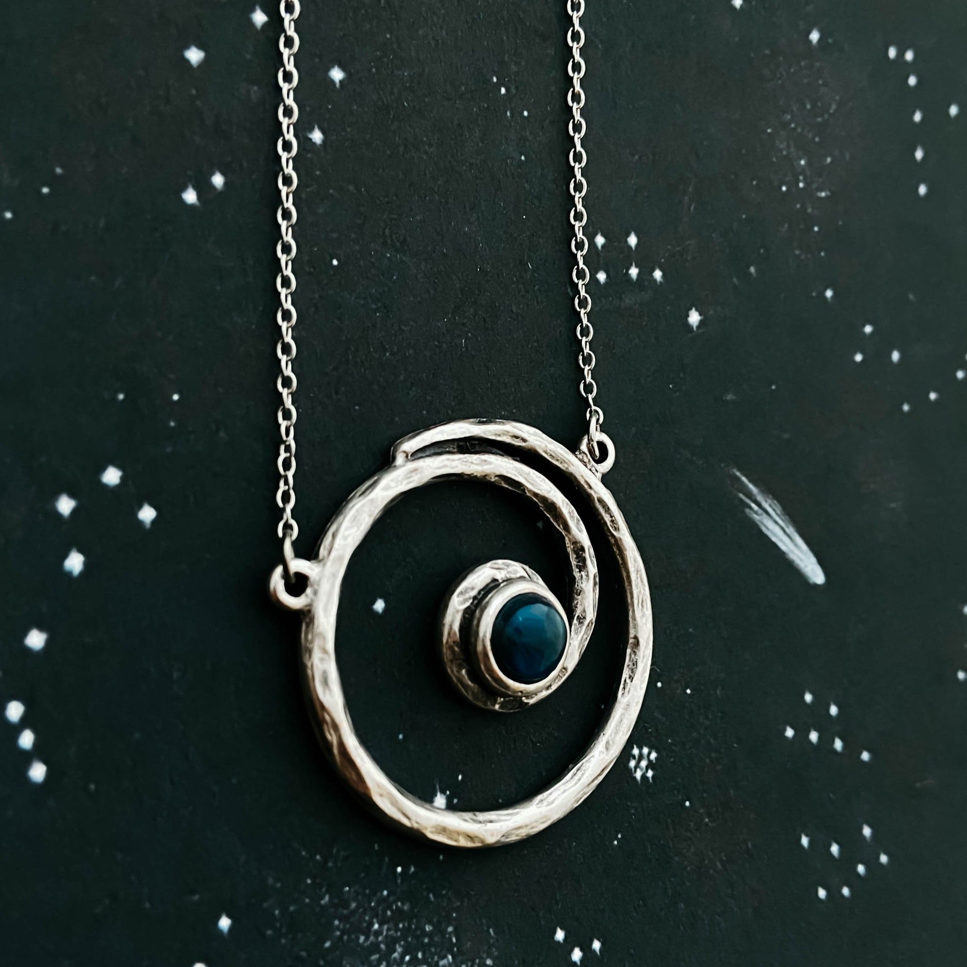 Indulge in the celestial allure of our Galactic Serenity Necklace with Labradorite, a captivating piece that seamlessly blends earthly elegance with cosmic inspiration. Crafted with meticulous attention to detail, this pendant features a hammered silver-tone spiral design that symbolizes the spiraling beauty of our galaxy, the Milky Way.